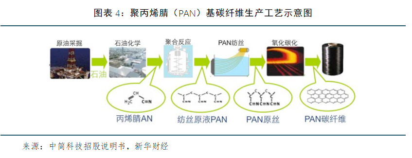 碳纤维生产流程长,工序多而复杂,工艺、技术和资金壁垒很高。完整的碳纤维产业链包含从一次能源到终端应用的完整制造过程。产业链上游企业从石油、煤炭、天然气均可以得到丙烯,丙烯经氨氧化后得到丙烯腈,丙烯腈聚合和纺丝之后得到聚丙烯腈(PAN) 原丝;产业链中下游企业再经过预氧化、低温和高温碳化后得到碳纤维,并可制成碳纤维织物和碳纤维预浸料,作为生产碳纤维复合材料的原材料;碳纤维经与树脂、陶瓷等材料结合,形成碳纤维复合材料,最后由各种成型工艺得到下游应用需要的最终产品。