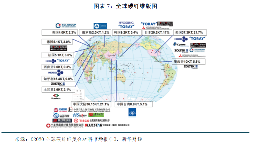 从全球产能区域分布来看,美国、中国和日本产能最大。根据《2020全球碳纤维复合材料市场报告》统计,2020年全球碳纤维运行产能约17.2万吨。分区域来看,美国运行产能3.7万吨,占全球22%;中国大陆位居第二,运行产能3.6万吨,占比21%;日本位列第三,运行产能2.9万吨,占比17%。日本和欧美传统巨头基本完成国际产业基地的布局,主导着全球碳纤维行业。同时新兴经济体在迅速追赶中,尤其是中国。