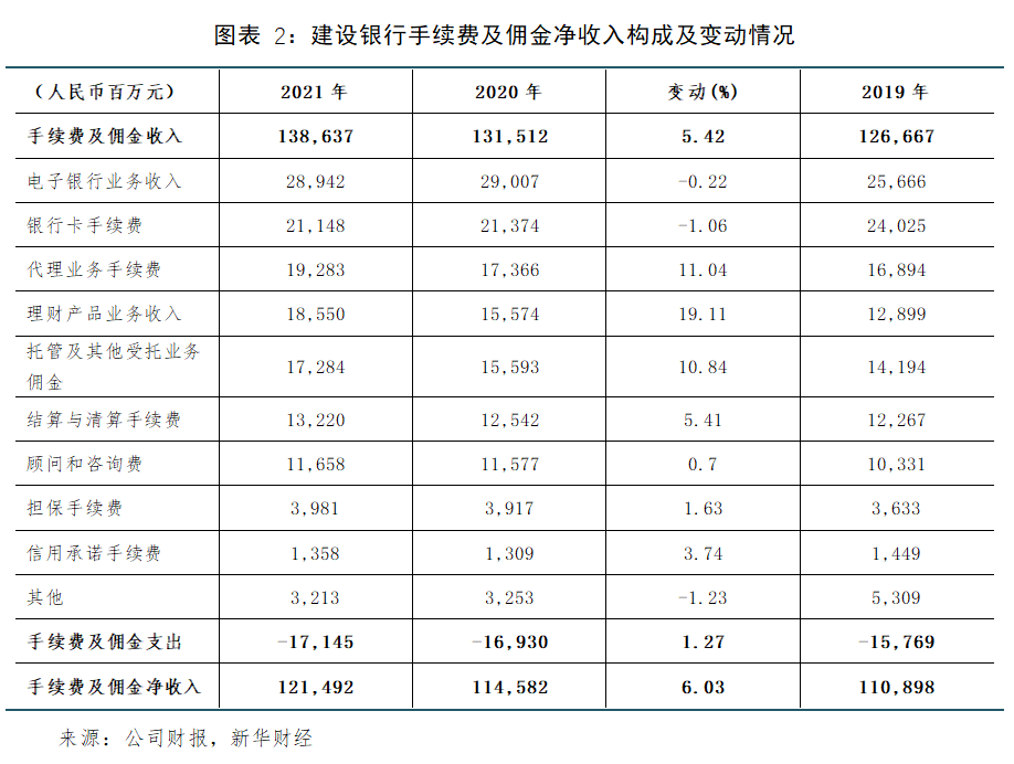 非息收入在保险、投资收益等其他非息收入增长带动下,快速增长26.55%。2021年,建设银行非利息收入2188.26亿元,同比21.60%,营业收入占比26.55%。其中,手续费及佣金净收入1214.92亿元,同比增长6.03%,占营业收入中的占比为14.74%。具体分项中,增速较高的是代理业务手续费收入(192.83亿元)、理财产品业务收入(185.50亿元)和托管及其他受托业务佣金收入(172.84亿元)等财富管理相关业务,分别同比增长11.04%、19.11%和10.84%。其他非利息收入973.34亿元,同比增长48.90%,具体分项中,保险业务收入441.48亿元,同比增长40.47%;投资收益239.21亿元,同比增长23.03%;汇兑收益73.33亿元,同比增长39.36%。