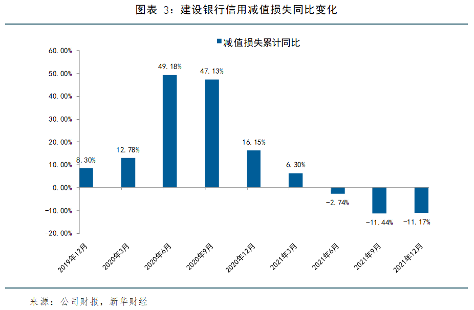减值损失方面,2021年建设银行计提减值损失1687.15亿元,同比减少11.17%。其中,发放贷款和垫款的减值损失为1503.24亿元,同比减少4.08%,金融投资减值损失162.95亿元,同比增长112.35%。为应对疫情冲击,建设银行2020年显著加大了减值损失计提力度,不过2021年随着风险逐步缓解,计提力度逐季减轻,减值损失连续三个季度同比下降。