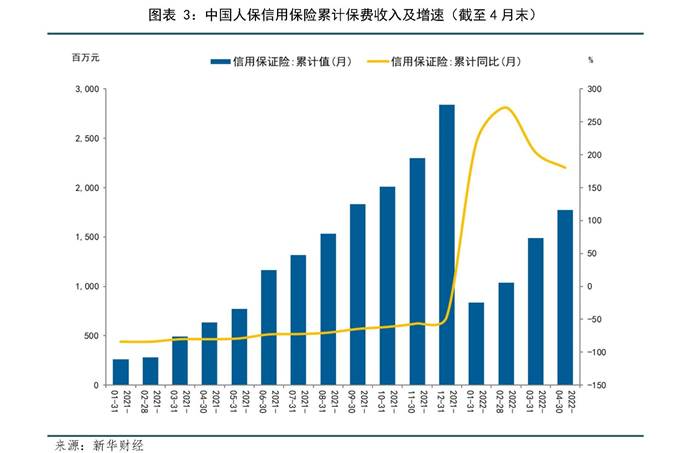 据中国人保披露的月度保费收入数据,截至4月末,累计实现信用保险保费收入17.75亿元,同比增长180.4%,今年前3个月累计同比增速均维持在200%以上。