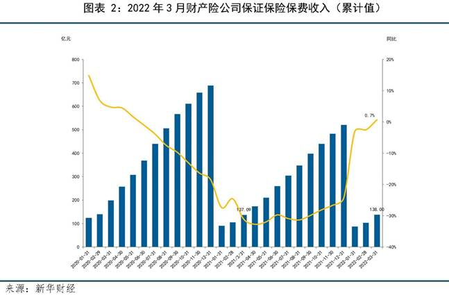 从行业数据来看,截至2022年3月末,我国财产险公司累计实现保证保险保费收入138亿元,同比增长0.7%,增速由负转正,大幅度提升。