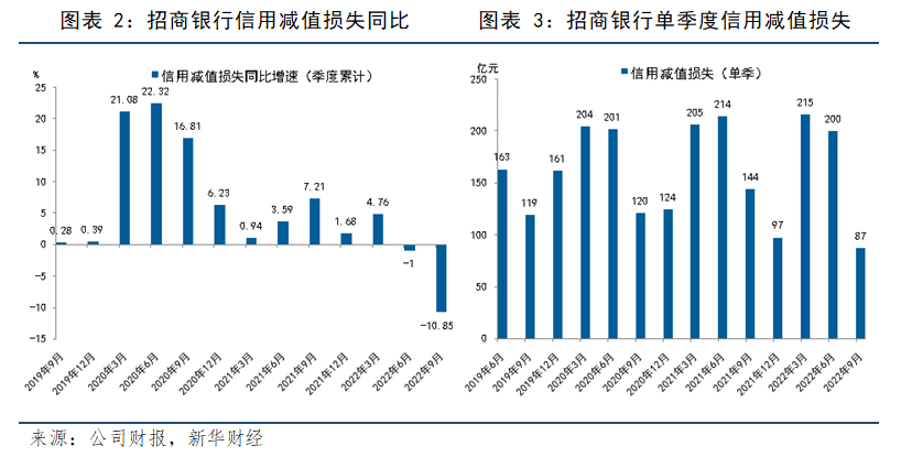 信用减值损失同比下降11%,拨备反哺利润。前三季度,招商银行信用减值损失501.67亿元,同比下降10.85%,与上半年相比,降幅扩大。上一次招商银行信用减值损失负增长出现在2018年上半年。单独看2022年第三季度,信用减值损失为86.69亿元,回到多年来的低位,同比减少40%。