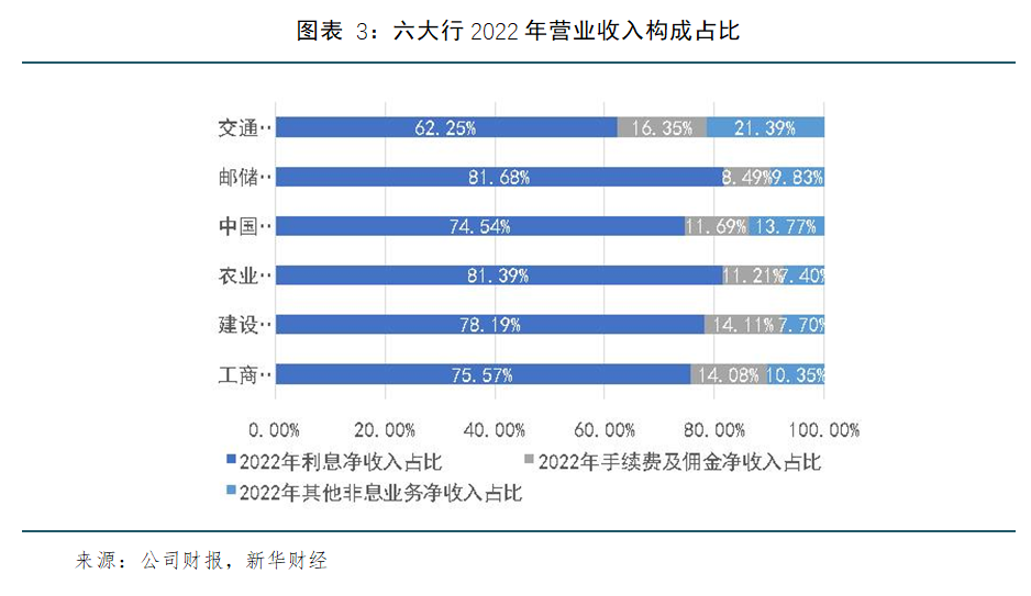 对营业收入细分科目进行分析发现(见图表3、图表4),占比超过六成的利息净收入仍是六大行营业收入的主要组成部分。除邮储银行外,其他五家银行2022年非息业务净收入普遍萎缩,利息净收入对于各行稳固营收大盘做出了主要正向贡献。