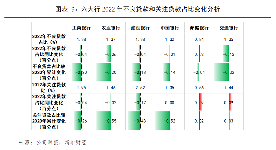 观察各行2022年关注贷款及不良贷款占比(见图9)发现,邮储银行关注贷款占比和不良贷款占比最低,分别为0.56%和0.84%,显著低于其他银行。此外,其他大行的不良贷款占比也有所下降,以交行同比降低0.13个百分点最为明显,但交行和邮储的关注贷款占比有所上升。