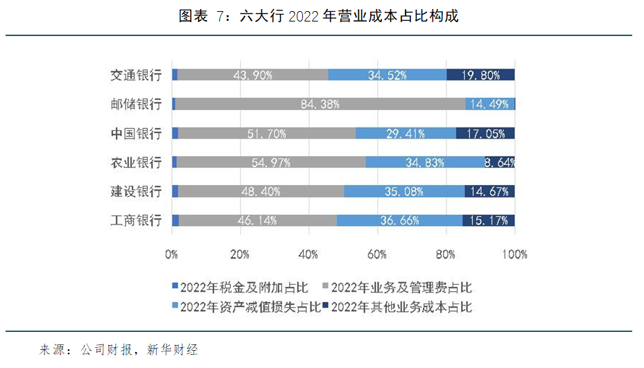 业务及管理费和资产减值损失两个科目主导了各行营业成本的变化(见图表7、图表8)。2022年,中国银行(51.70%)、农业银行(54.97%)和邮储银行(84.38%)业务及管理费的占比均超过50%。其中,邮储银行的业务及管理费在2022年增长9.36%,在营业成本占比中增长5.34个百分点至84.38%,费用规模远超其他五家银行。究其原因,邮储银行表示,由于邮政代理网点吸引个人客户存款规模增长,该行储蓄代理费在2022年增加130.66亿元,增长14.65%。高额的储蓄代理费也是邮储银行在成本端有别于其他银行的一大特点。