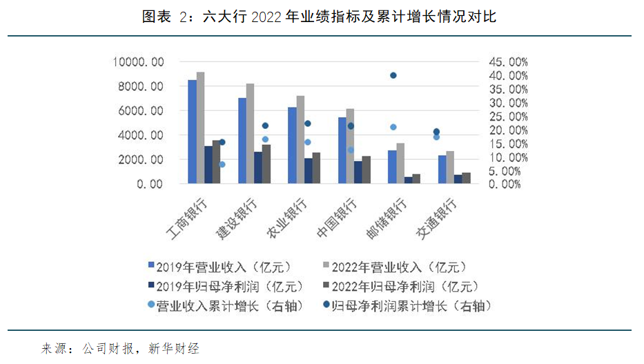 在收入端,除工行和中行数据略逊一筹外,其他四家银行2022年营业收入较2019年的累计增幅均超过15%。而在利润端,除工行因基数原因稍低外,建行(+21.42%)、农行(+22.18%)、中行(+21.36%)和交行(+19.24%)四家银行归母净利润的累计增幅均在20%左右。值得注意的是,邮储银行的增长态势在六大行中更是呈现“断层”领先,其营业收入和归母净利润的累计增幅分别为21.01%和39.87%。