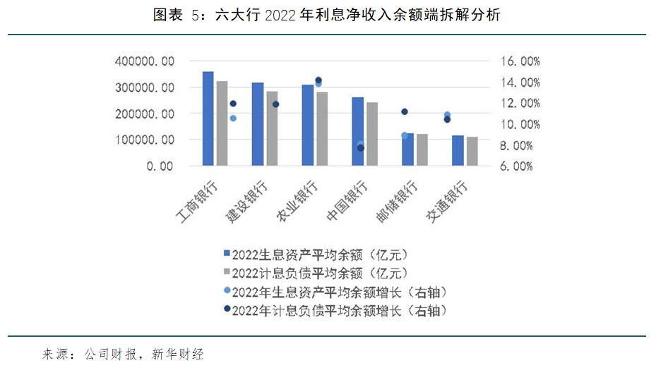 再对利息净收入进行拆解发现(见图表5、图表6),在净息差普遍降低、拖累各行利息净收入的2022年,交通银行和建设银行的生息资产平均余额增速均大于或等于计息负债平均余额增速,使其在六大行中依然实现了较高的利息净收入增速(+5.10%、+6.22%)。
