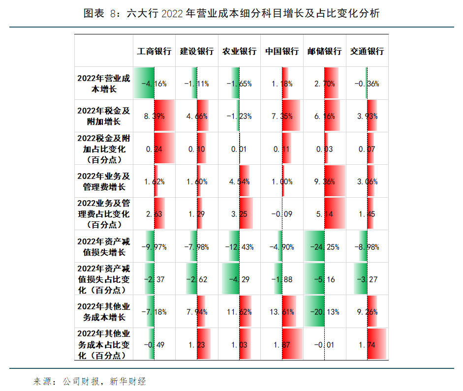 成本方面,六大行2022年一方面加强全面成本管理,持续优化费用支出结构,加大对重点产品、重点领域和重点地区的资源倾斜,促进提升费用精细化管理水平,提高资源投入产出效率;另一方面在资产质量持续好转,具备充分的风险抵御和损失吸收能力的前提下,各行资产减值损失规模同比下降,反哺利润增长。
