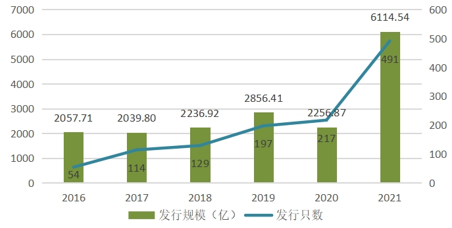 2021年,我国绿色债券发行规模强势增长。全年境内绿色债券发行规模6114.54亿元,较2020年的2256.87亿元上升170.93%;发行只数相较于2020年的217只增长了126.27%。2016年至2020年的发行规模和只数仅在2000-3000亿元和50-250只之间。与往年相比,2021年绿色债券发行规模和只数都超过2019年和2020年两年总和。