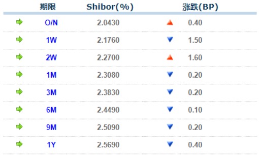 23日上海银行间同业拆放利率(Shibor)整体波动甚微。其中,隔夜Shibor涨0.40BP,报2.0430%;7天Shibor跌1.50BP,报2.1760%;14天Shibor涨1.60BP,报2.2700%。