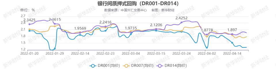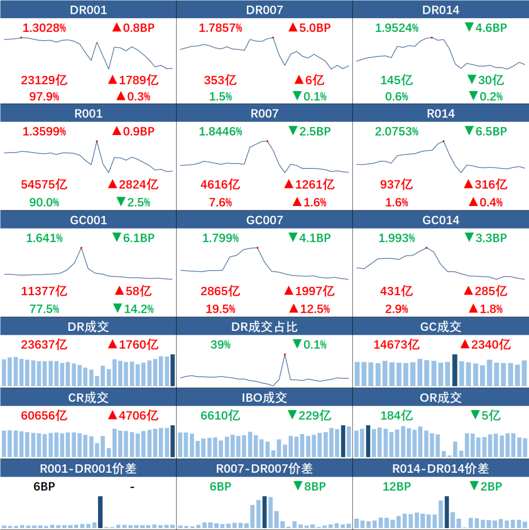 银行间质押式回购市场隔夜品种基本持平,7D品种走势分化,14D品种小幅回落。具体看,DR001、R001加权平均利率分别上行0.8BP、0.9BP,报1.3028%、1.3599%;成交额分别报23129亿元、54575亿元。DR007、R007加权平均利率分别上行5BP、下行2.5BP,报1.7857%、1.8446%;成交额占比下行0.1个、1.6个百分点。DR014、R014加权平均利率分别下行4.6BP、6.5BP,报1.9524%、2.0753%;成交额分别减少30亿元、增加316亿元。