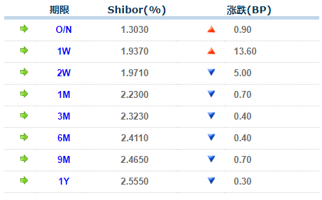 受资金面变化影响,当日上海银行间同业拆放利率(Shibor)隔夜及7天品种转涨,其余品种整体下行。其中隔夜Shibor涨0.90BP,报1.3030%;7天Shibor涨13.60BP,报1.9370%;14天Shibor跌5.00BP,报1.9710%。