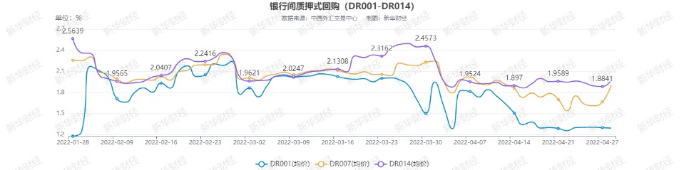 银行间质押式回购市场隔夜品种续跌,跨月期7D及14D资金利率有所上行。具体看,DR001、R001加权平均利率分别下行0.7BP、0.5BP,报1.2938%、1.3639%,自4月15日起,DR001已连续11个交易日围绕1.3%上下波动;成交额分别报16259亿元、38225亿元。DR007、R007加权平均利率分别上行23.7BP、13.3BP,报1.9023%、2.0467%;成交额占比上行3.7个、9.4个百分点。DR014、R014加权平均利率分别上行8.9BP、4.5BP,报1.9731%、2.0745%;成交额分别增加106亿元、减少898亿元。
