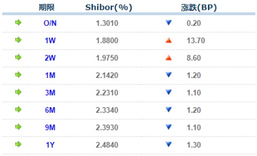 当日上海银行间同业拆放利率(Shibor)7天期品种涨幅扩大,14天品种也转为上行。其中,隔夜Shibor跌0.20BP,报1.3010%;7天Shibor涨13.70BP,报1.8800%;14天Shibor涨8.60BP,报1.9750%。