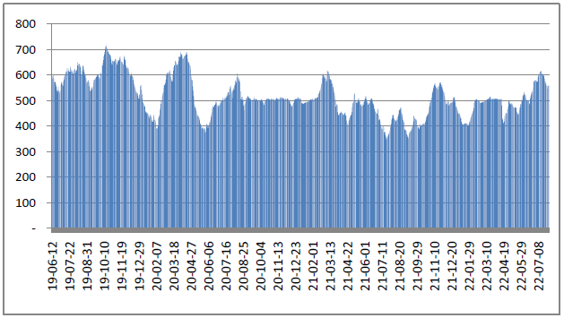 图表:秦皇岛港港口煤炭库存(单位:万吨)