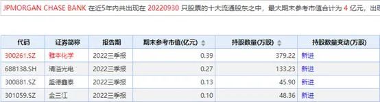 数据显示,摩根大通三季度末持有雅本化学379.22万股,持仓市值为0.39亿元,占流通股本的0.4%;持有清溢光电133.23万股,持仓市值0.27亿元,占流通股本的1.63%;持有盛德鑫泰45.9万股,持仓市值0.13亿元,占流通股本的1.73%;持有金三江48.36万股,持仓市值0.1亿元,占流通股本的1.4%。