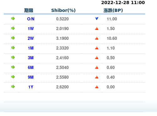 受资金面变化影响,28日上海银行间同业拆放利率(Shibor)隔夜品种再度回落超10BP,14天品种涨至3%上方。其中,隔夜Shibor跌11.00BP,报0.5220%;7天Shibor涨1.50BP,报2.0190%;14天Shibor涨10.60BP,报3.1900%。