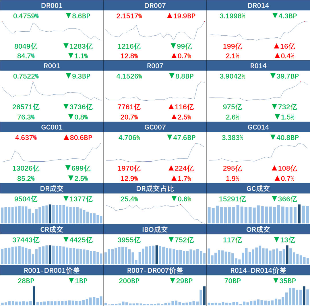 银行间质押式回购市场方面,DR001跌破0.5%,续刷新低,R007与DR007走势分化,成交额占比超20%。具体看,DR001、R001加权平均利率分别下行8.6BP、9.3BP,报0.4759%、0.7522%;成交额分别减少1283亿元、3736亿元。DR007、R007加权平均利率分别上行19.9BP、下行8.8BP,报2.1517%、4.1526%;成交额分别减少99亿元、增加116亿元。DR014、R014加权平均利率分别下行4.3BP、39.7BP,报3.1998%、3.9042%;成交额分别增加16亿元、减少732亿元。