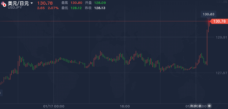 日本央行利率决议公布后,美元兑日元一度上涨超250点报130.83,日内涨逾2%。