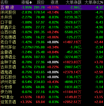 截至6日收盘,白酒板块除迎驾贡酒和*ST皇台外集体收跌。五粮液收跌近4%,洋河股份、水井坊收跌逾2%,口子窖、山西汾酒、贵州茅台、金微酒等跌超1%,泸州老窖、酒鬼酒微幅收跌。