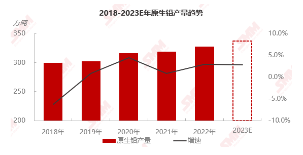 2022年中国电解铅产量为327.8万吨,同比增长2.91%。2022年原生铅冶炼企业新增与复产并存,而铅精矿供应偏紧,加工费维持低位震荡,冶炼企业利润有限,上半年企业依靠白银、硫酸的副产品收益维持生产,下半年铅价回升利润修复,全年产量录得正增长。2023年原生铅企业新扩建项目继续投产,预计增加铅产能20-25万吨/年,而新产能是否达产的压力转移至原材料端。