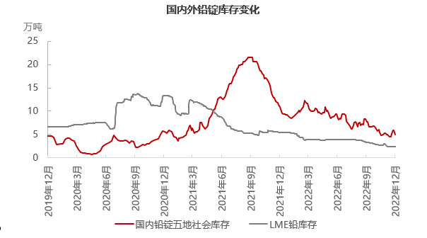 2022年国内外铅锭均呈现去库状态,截至2022年12月底,伦铅库存为2.5万吨,较去年同期减2.94万吨;SMM国内铅锭社会库存总数为3.82万吨,较去年同期减5.71万吨。两者的差异在于,前者主动去库,后者被动去库。疫情以来,海外铅冶炼企业减停产增多,尤其2022年三季度欧洲能源供应短缺,生产成本高昂,铅冶炼企业减产程度扩大,LME铅库存降至十五年低位。国内则更多依靠出口转移促成去库,据海关数据,2022年铅锭出口量为12.59万吨,同比增加21.54%。2023年海外铅冶炼企业开始复产,国内再生铅新扩建产能等待释放,考虑到海外铅库存水平较低,若铅消费如期复苏,国内铅锭仍有出口机会,这也是2023年中国铅锭库存能否保持低库存的关键因素。