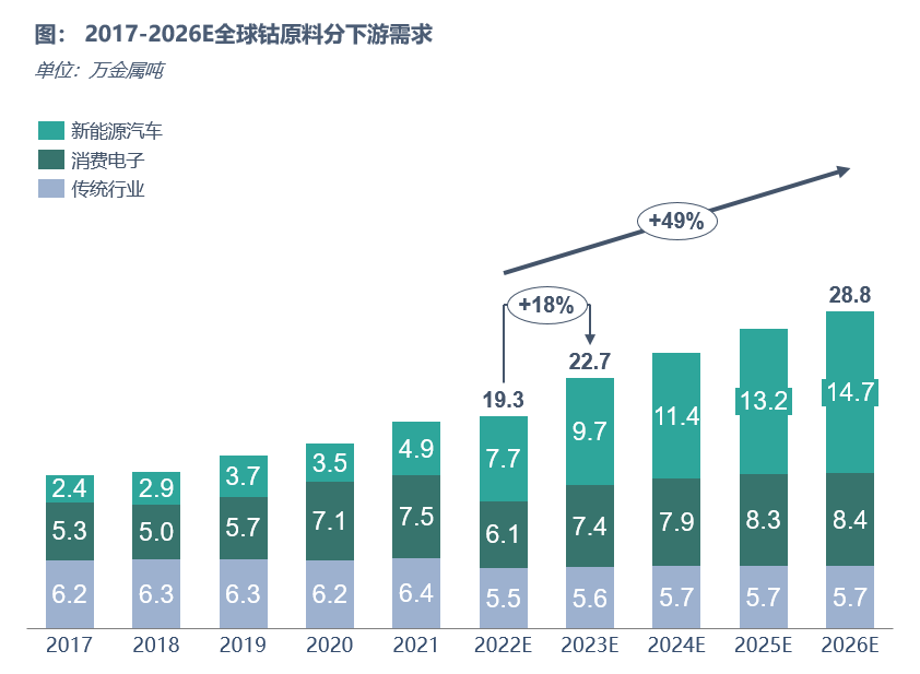 2023年,预计全球钴市场趋势累库,供应仍将大于需求,电解钴价格趋势下行。供应端,嘉能可、洛阳钼业及印尼镍钴项目等新产能将投放,预计2023年全球钴供给量为23.6万金属吨,增速12%。需求端,数码消费市场需求减弱,动力市场因三元切换铁锂产品叠加三元产品往低钴方向发展,钴需求增速放缓,预计2023年全球整体钴需求量为22.3万金属吨,同比增加15% 。