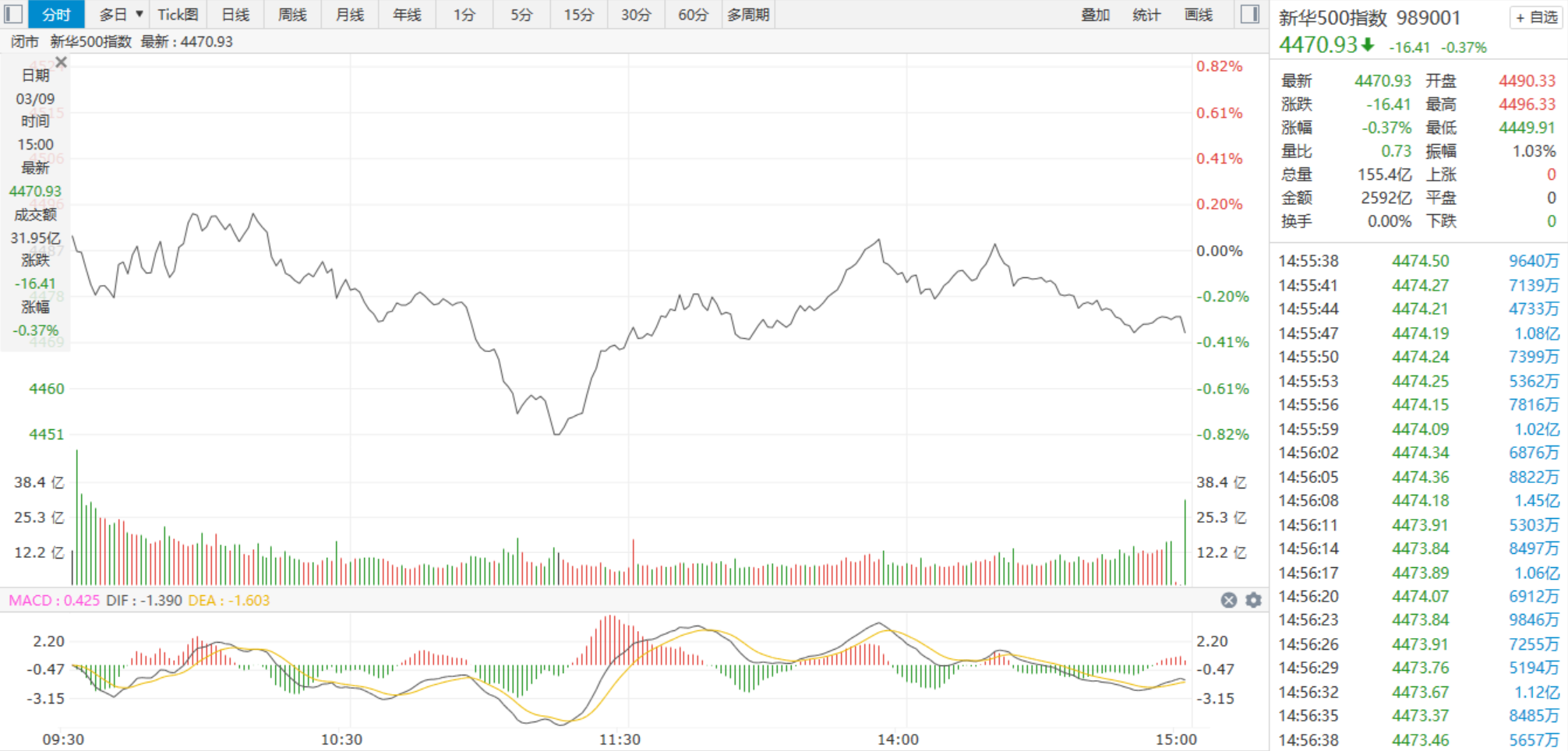 新华500指数(989001)9日收盘跌0.37%,报4470.93点。指数盘中最高触及4496.33点,最低触及4449.91点,成分股全天总成交额报2592亿元。