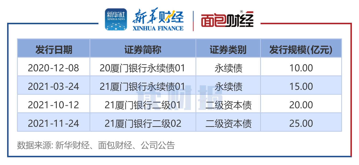 2021年10月,厦门银行发行了10年期固定利率二级资本债,发行规模为20亿元,票面利率4.20%,募集资金用于补充二级资本。次月,该行再次发行了10年期固定利率二级资本债,发行规模25亿元,票面利率3.94%,用于补充二级资本。