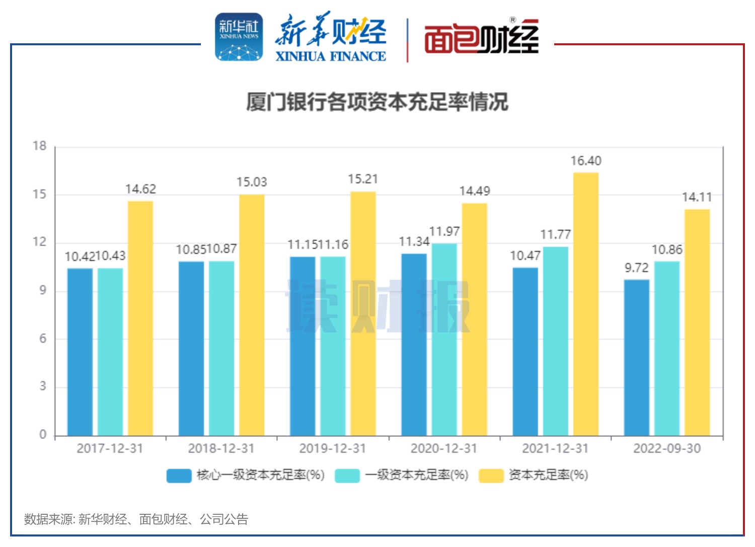 截至2022年9月末,厦门银行的资本充足率为14.11%,较上年末下降2.29个百分点;一级资本充足率为10.86%,较上年末下降0.91个百分点;核心一级资本充足率为9.72%,较上年末下降0.75个百分点。