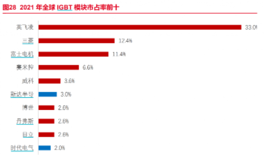 不过,得益于IGBT产品更新迭代缓慢,给予本土IGBT厂商技术追赶时间。根据2021年英飞凌财报显示,士兰微在全球IGBT单管及IPM市占率达到3.5%、2.2%,均位列全球第八;而斯达半导在全球IGBT模块市占率达3.0%,位列全球第六。