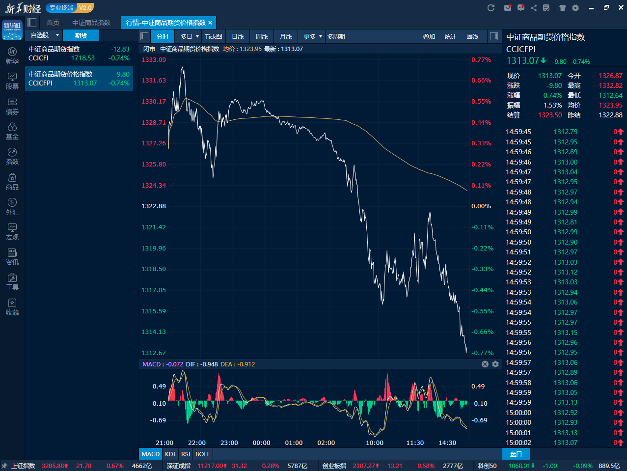 截至27日下午收盘,追踪国内商品市场的中证商品期货价格指数收报1313.07点,较前一交易日下跌0.74%;中证商品期货指数收报1718.53点,较前一交易日下跌0.74%。