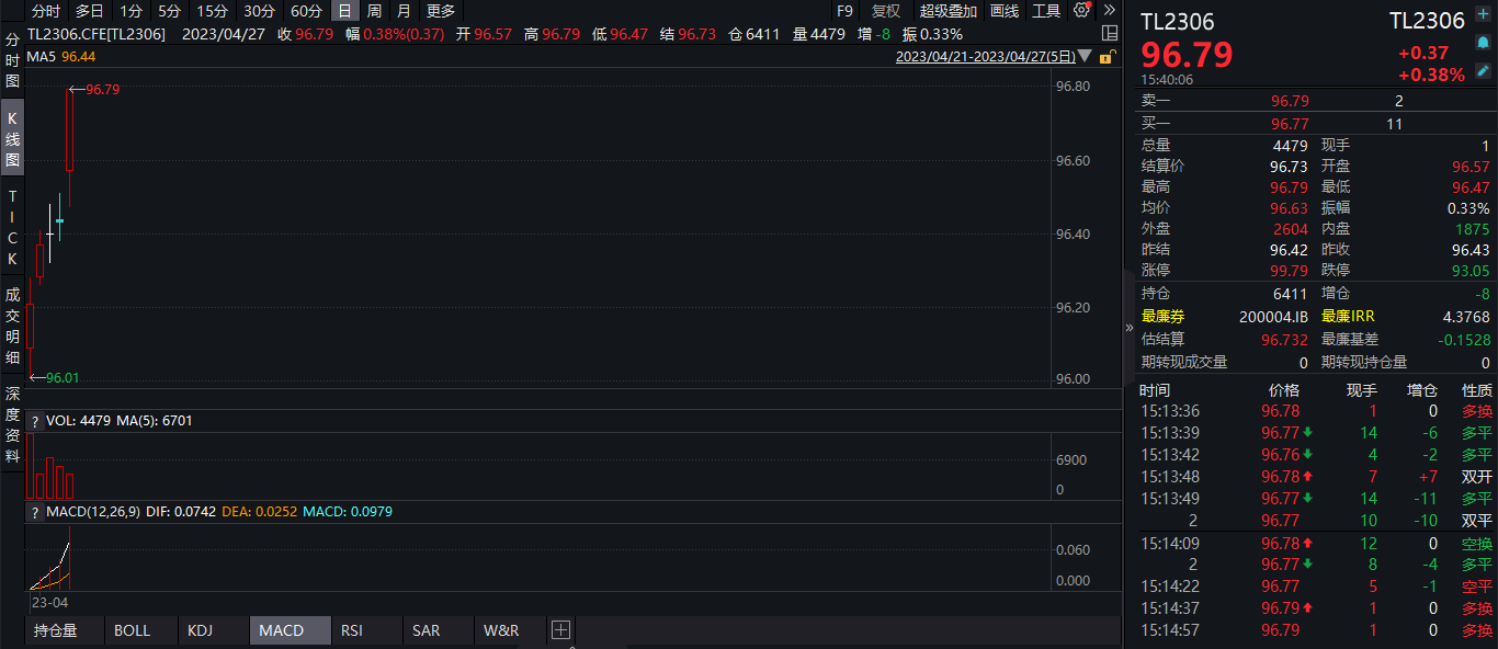 新华财经北京4月28日电(王菁)30年期国债期货上市已满五个工作日,主力合约涨势强劲、连创新高。截至4月27日收盘,TL2306收于上市新高96.79元,当日涨幅达0.38%,较挂牌基准价累计上涨0.97%。受到超长端品种提振,5年期和10年期合约当日收创逾5个月新高。