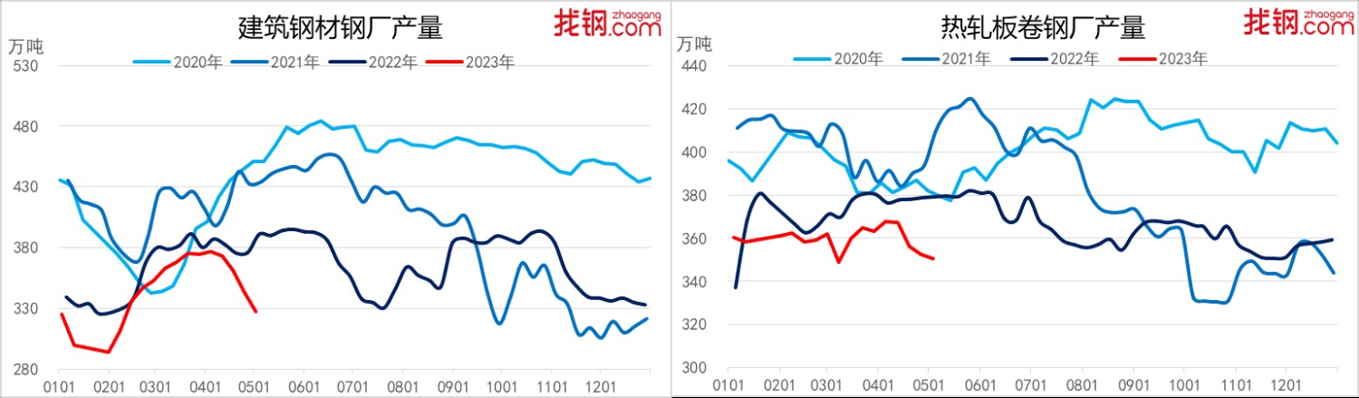 钢材生产方面,截至5月3日,找钢网跟踪调研的国内钢材周度总产量为790.03万吨,月环比下降67.16万吨,环比降幅7.8%。