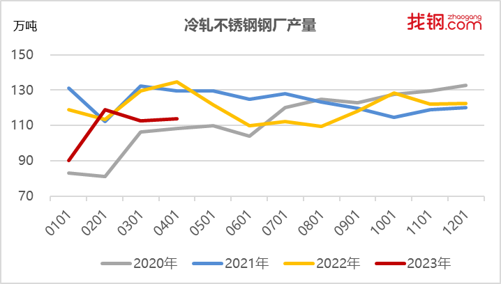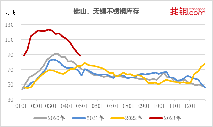 从不锈钢库存来看,截至4月28日,佛山、无锡两地不锈钢库存88.11万吨,环比上月降20.4%,同比去年增18.5%。由于下游情绪有所好转,补库意愿增强,不锈钢库存总量延续降势,但仍处于历史同期相对高位。