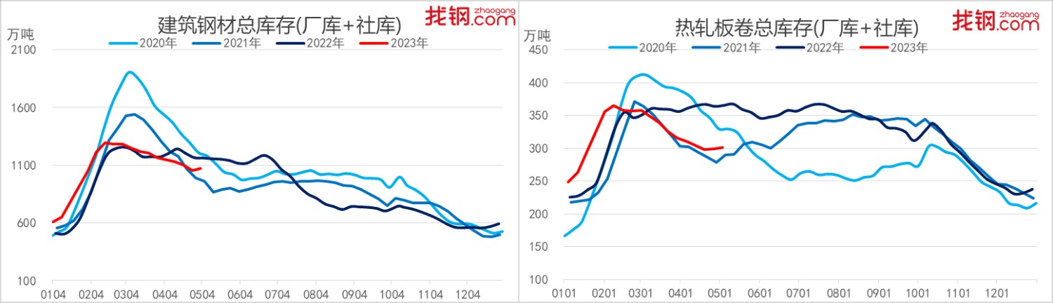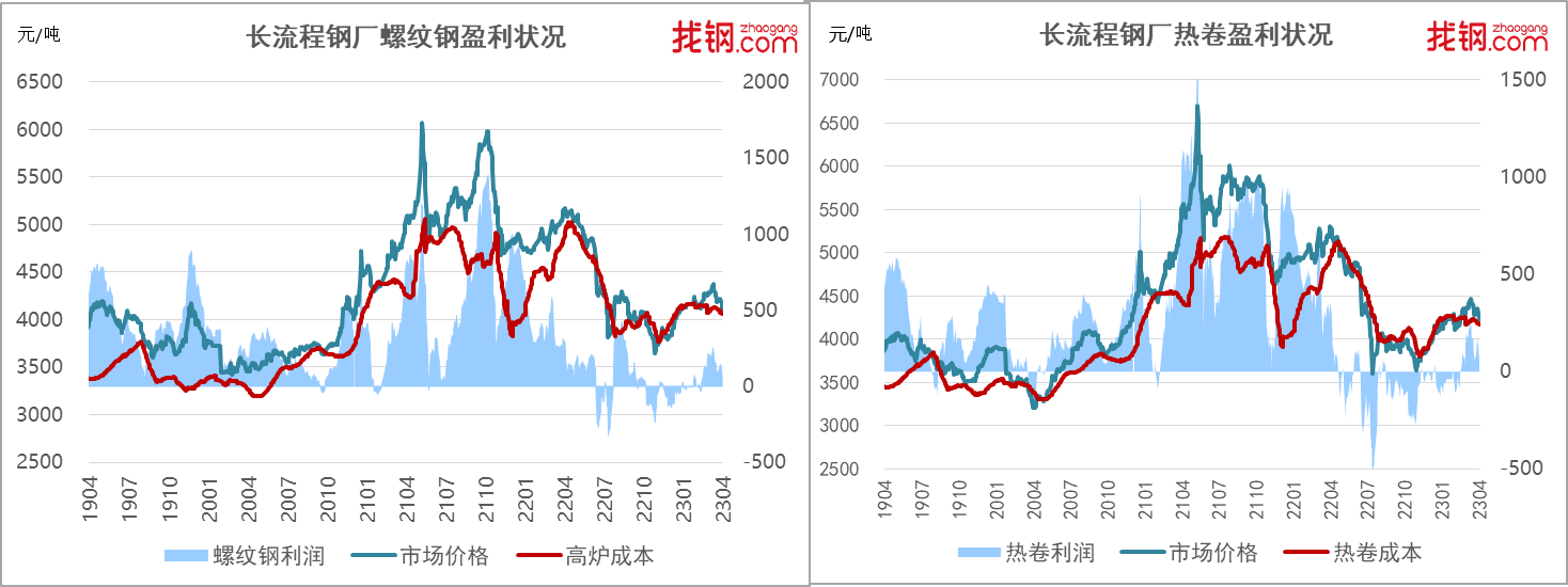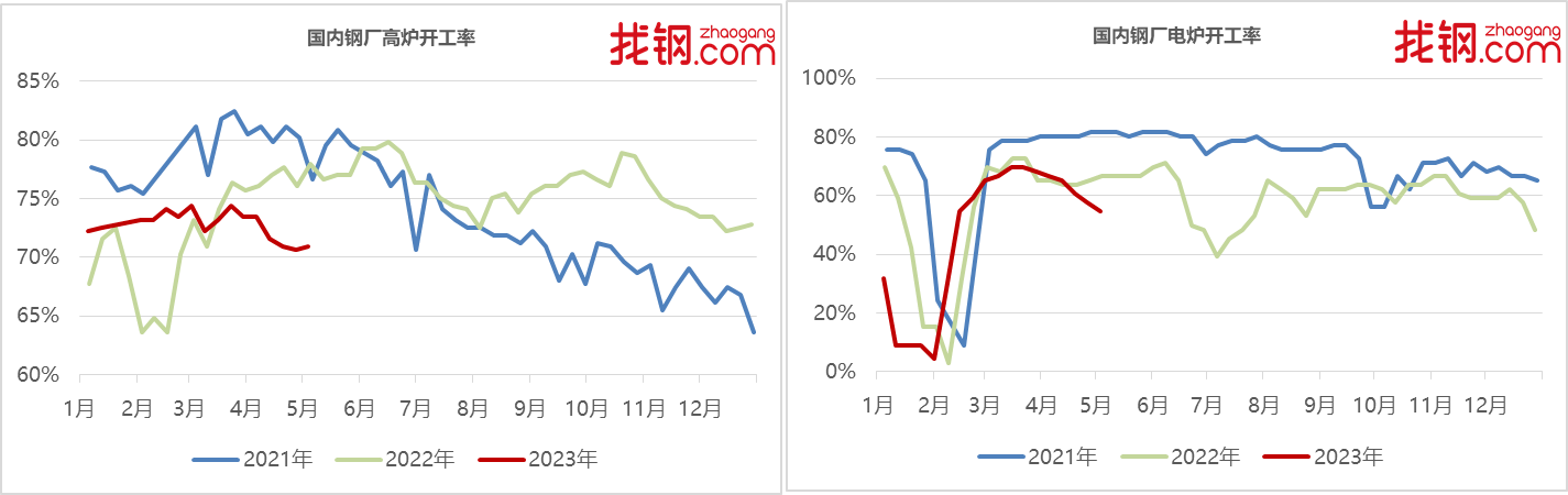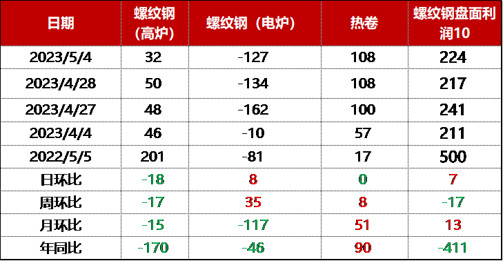 具体来看,利润方面,截至5月4日,找钢网调研的高炉和电炉钢厂螺纹钢吨钢生产利润分别为32元/吨和-127元/吨,月环比分别下降15元/吨和117元/吨,年同比分别下降170元/吨和46元/吨。