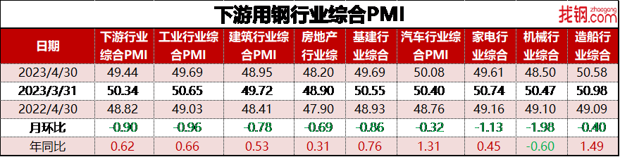 2023年4月份,找钢网调研的下游行业PMI综合指数49.44%,较上月环比降0.9个百分点,较去年同比升0.62个百分点。