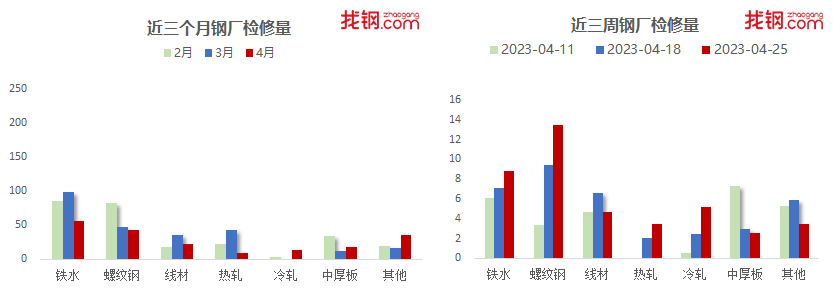 4月份以来,随着钢价明显回落,钢厂生产利润再次被挤压,叠加需求有所下滑,钢厂减产检修情况有所增多。据找钢网不完全统计,4月国内有35家钢厂存在检修,其中检修影响铁水56.26万吨,螺纹42.91万吨,线材22.55万吨,热轧8.51万吨,冷轧13.29万吨,中厚板17.56万吨,其他19.31万吨。从具体数据来看,4月下旬以来国内钢厂减产检修情况明显增多,但同比来看目前钢厂减产力度依然偏小。