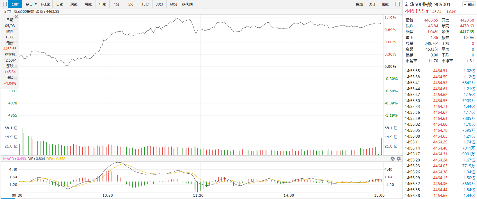 新华财经北京5月8日电(林郑宏)新华500指数(989001)8日收盘涨1.04%,报4463.55点。