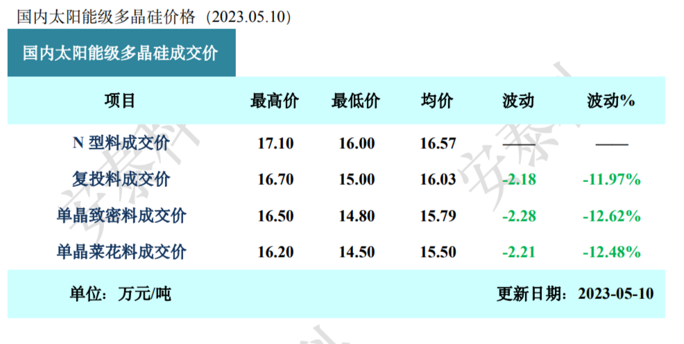根据中国有色金属工业协会硅业分会对11家多晶硅生产企业产品成交价格的统计,本周(截至5月10日)国内复投料、单晶致密料和单晶菜花料成交均价的环比跌幅都在一成以上。且据硅业分会介绍,本周硅料市场价格大幅下跌,成交情况并不乐观,有新订单的企业数量有8家,二线企业签单节奏明显谨慎,成交量不大。