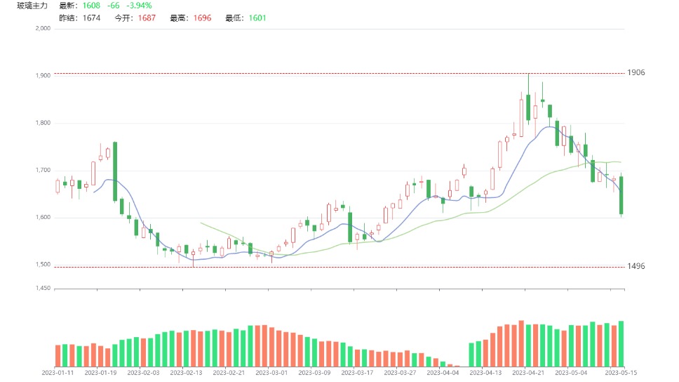 新华财经北京5月15日电(吴郑思) 自4月21日刷新1906元/吨的近一年高点之后,玻璃期价便开启了回落之路。5月15日早盘,玻璃主力合约重挫超4%,盘中一度逼近1600元/吨关口,近13个交易日累计最大跌幅超300元,并基本回吐了3月下旬以来的涨幅。