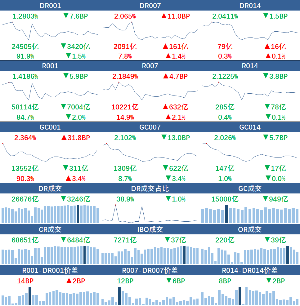 银行间质押式回购市场方面,隔夜资金利率下行、成交额下降。具体看,DR001、R001加权平均利率分别下行7.6BP、5.9BP,报1.2803%、1.4186%;成交额分别下降3420亿元、7004亿元。DR007、R007加权平均利率分别上行11.0BP、4.7BP,报2.065%、2.1849%;成交额分别上升161亿元、632亿元。DR014、R014加权平均利率分别下行1.5BP、3.8BP,报2.0411%、2.1225%;成交额分别变动16亿元、-78亿元。