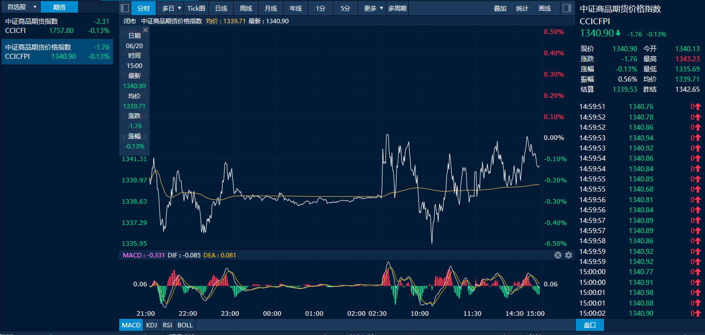 截至20日收盘,追踪国内商品市场的中证商品期货价格指数收报1340.90点,较前一交易日下跌0.13%;中证商品期货指数收报1757.80点,较前一交易日下跌0.13%。