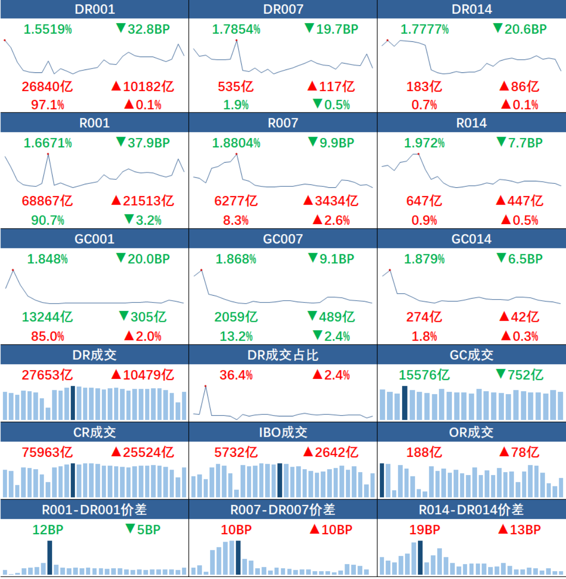 银行间质押式回购市场方面,各品种利率悉数下跌,但成交显著放量。具体看,DR001、R001加权平均利率分别下行32.8BP、37.9BP,报1.5519%、1.6671%,成交额分别增加10182亿元、21513亿元;DR007、R007加权平均利率分别下行19.7BP、9.9BP,报1.7854%、1.8804%,成交额分别增加117亿元、3434亿元;DR014、R014加权平均利率分别下行20.6BP、7.7BP,报1.7777%、1.972%,成交额分别增加86亿元、447亿元。