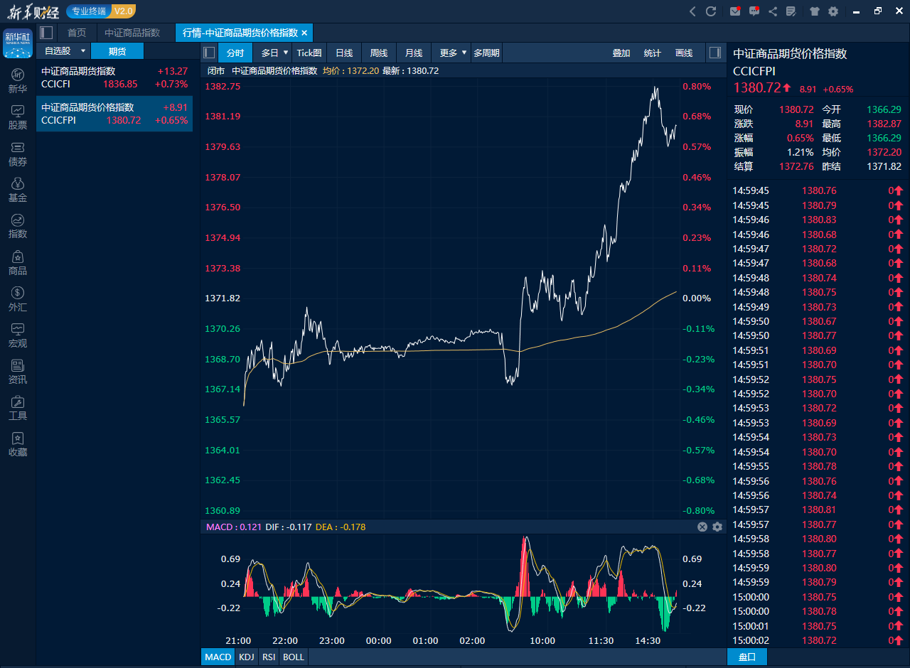 截至15日下午收盘时,追踪国内商品市场的中证商品期货价格指数收报1380.72点,较前一交易日上涨8.91点,涨幅0.65%;中证商品期货指数收报1836.85点,较前一交易日上涨13.27点,涨幅0.73%。