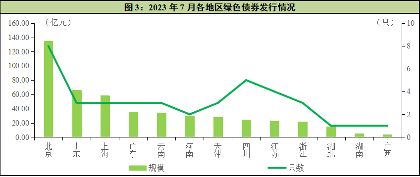 北京地区央企、国企集中度较高,经济发达且对双碳目标响应较为积极,历来都是绿色债券发行最火热的地区。2023年7月,北京地区共发行8只绿色债券,规模共计134.98亿元,只数与规模均领先于其他省份,是唯一发行规模超百亿的地区;四川省(5只,24.75亿元)和江苏省(4只,22.46亿元)在发行数量上分别排名第二和第三位;山东省(3只,65.98亿元)和上海市(3只,58.38亿元)的威海银行和上海农商行绿色债券发行规模较大,助力两个地区在发行规模位居第二和第三。