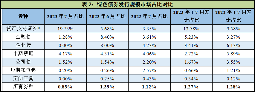 从绿色债券在整体债券市场中发行规模占比来看,2023年7月绿色债券占整体债券市场发行规模的0.83%,环比下降0.56%,同比下降0.29%。其中绿色资产支持证券占比达19.73%,环比增长14.05%,同比增长16.38%;其余券种占比均较低。截至7月末,2023年绿色债券占整体债券市场发行规模的1.27%,较去年同期下降0.01%,其中绿色资产支持证券占比较去年同期增长显著,是唯一占比超过10.00%的券种;绿色金融债和绿色定向工具占比同样有所增长;其余券种占比均有所下降。