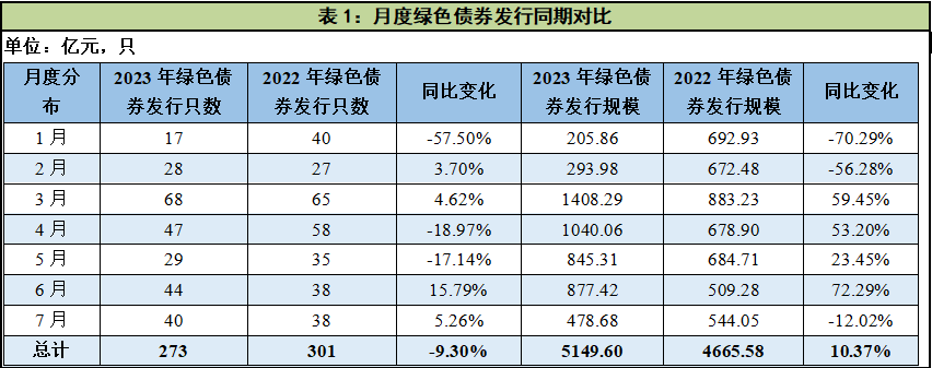 截至7月末,2023年国内绿色债券已累计发行273只,规模达5149.60亿元,较去年同期相比发行只数下降9.30%,发行规模增长10.37%。整体来看,2023年绿色债券一级市场呈“低开高走”态势,在经历年初假期因素和债市波动影响后势头有所回暖,3月份发行数量与规模均达到顶峰,进入二季度后发行热度整体保持稳定,7月份受周期因素影响发行热度有所下降。
