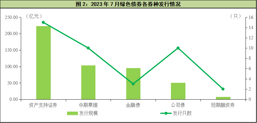 2023年7月,国内市场发行的绿色债券种类包括绿色资产支持证券(15只,223.38亿元)、绿色中期票据(10只,103.00亿元)、绿色金融债(3只,95.00亿元)、绿色公司债(10只,50.30亿元)和绿色短期融资券(2只,7.00亿元),其中绿色资产支持证券发行只数最多、规模最大。